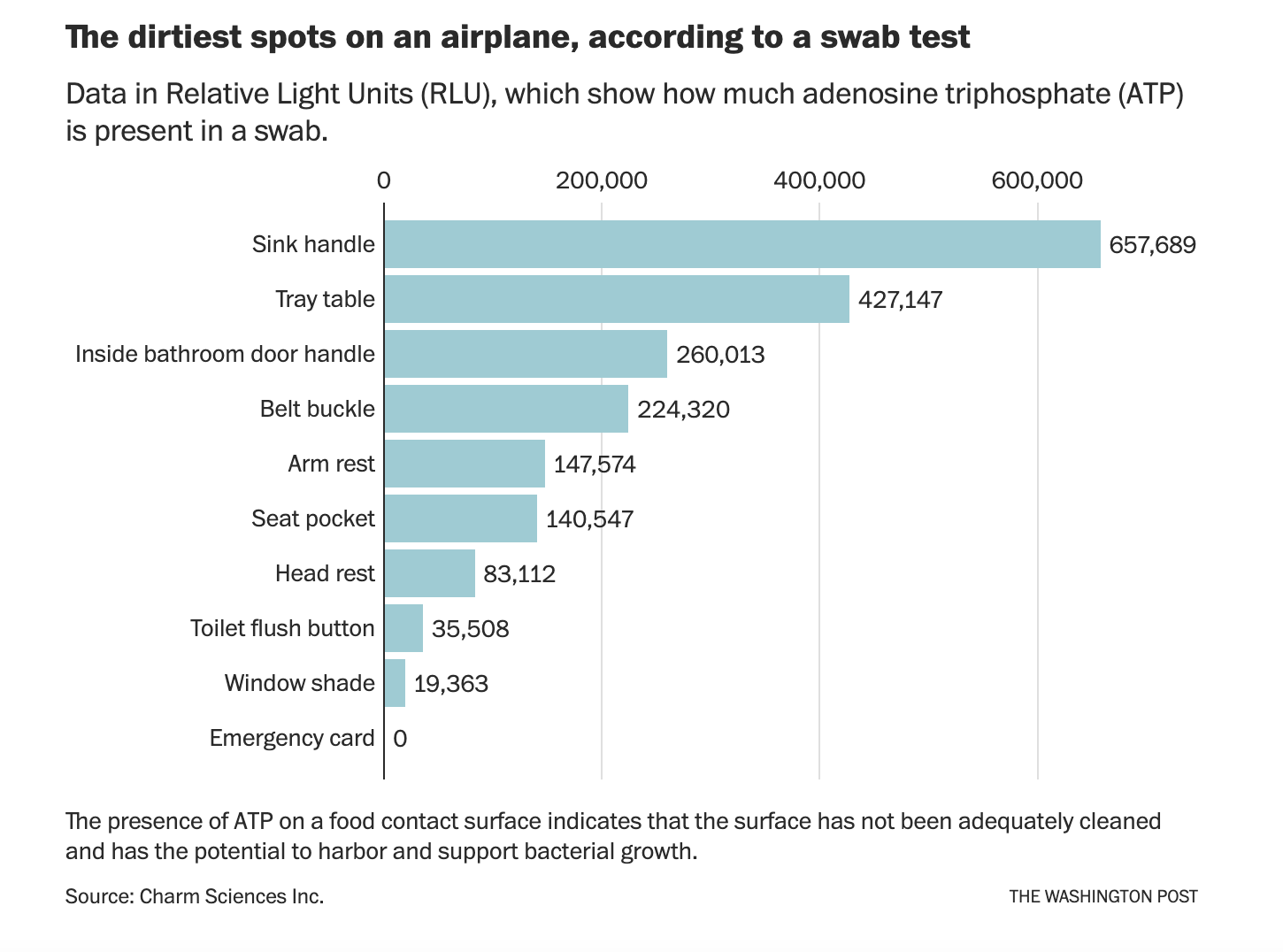 A side note regarding hygiene on planes: if you are going to eat in-flight, do not put your food directly on the tray table as it’s one of the dirtiest spots on a plane. Wipe it with disinfectant wipes first and then cover it with tissues or something like a magazine. I actually wipe everything including my seat, screen and seatbelt buckle and have been doing so long before COVID. And please, please don’t touch stuff in the lavatories or go to the bathroom barefoot (yes, I’ve seen this more than once).