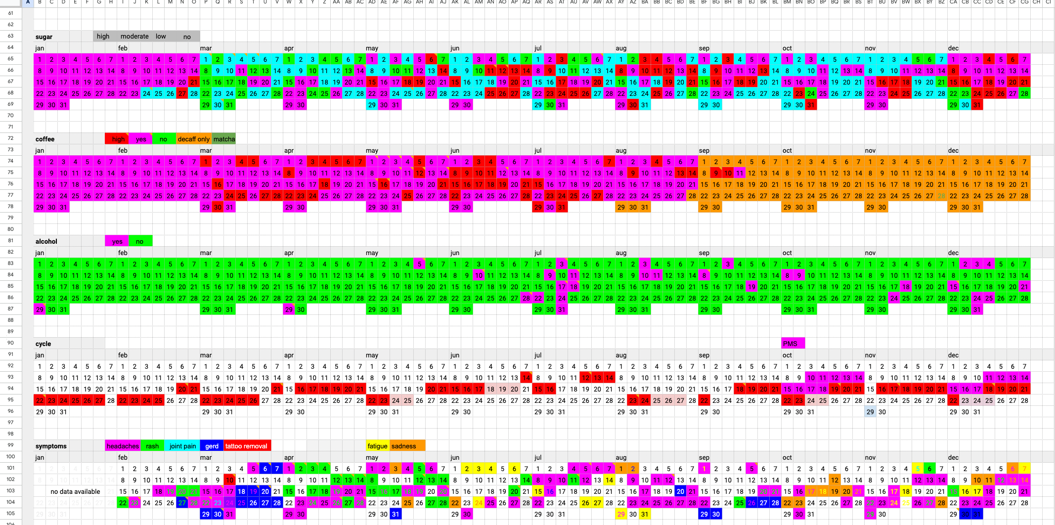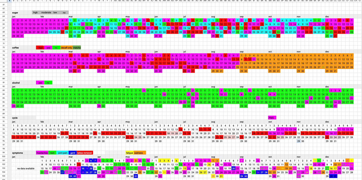 Various experiments ensued - from eliminating entire food groups to ingesting bagful of supplements, more testing, meditation and breath-work protocols, sauna and cold exposure, fasting and so on. And every single day, we minutely tracked each symptom, each lifestyle intervention and habit in a massive spreadsheet. But the more data we amassed, the more difficult it became to see patters and correlations. There had to be a better way to do this than spreadsheets, so we decided to build it.