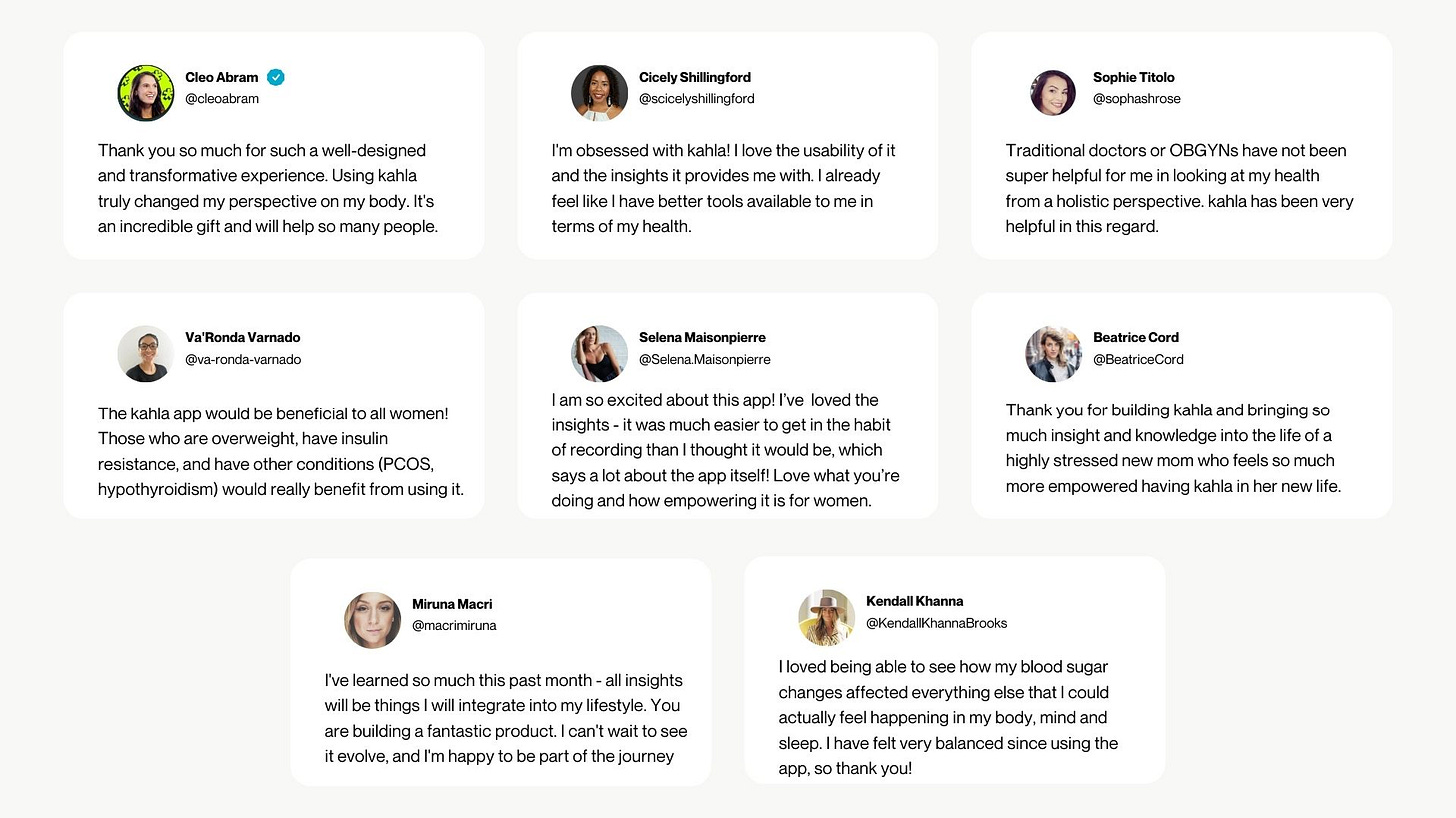The story of how kahla was born is a common one: someone has a problem that is painful enough, that they can’t find a good solution to so they decide to come up with one, thinking that surely there must be others out there struggling with the same problem. When we described kahla to other women, the response was always along the lines of “I’ve been waiting for a product like this forever.” But we wanted to make sure we actually had a product, so we built an MVP and beta tested it in cohorts to get as much feedback as possible.